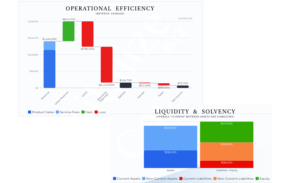 A dedicated view for the current financial health of the business. Detailed analysis of profit-and-loss statements and balance sheet health.